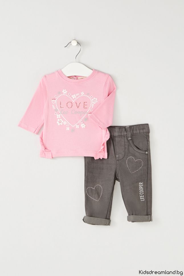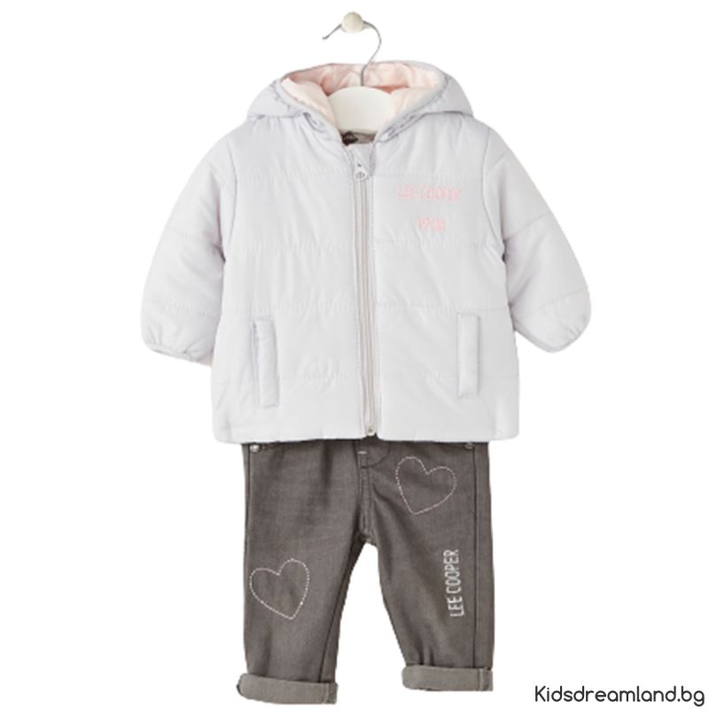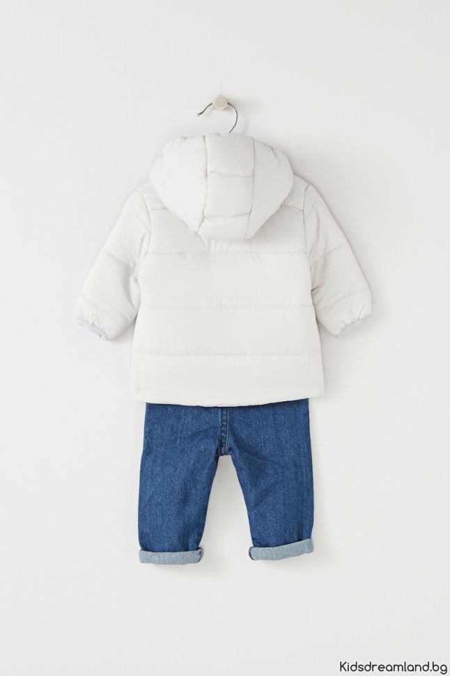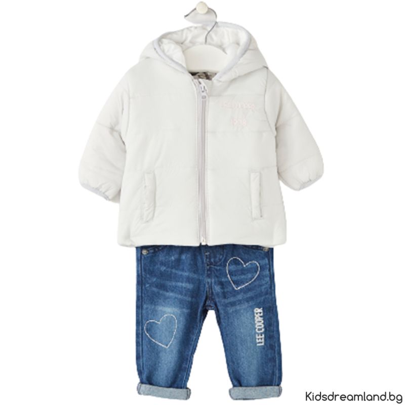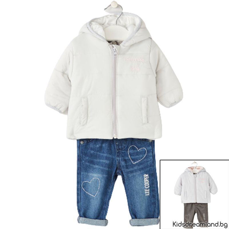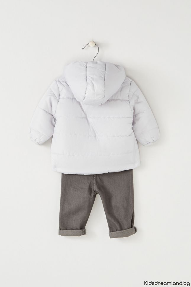 Този комплект се състои от парка, топ с дълъг ръкав и панталон тип дънки.