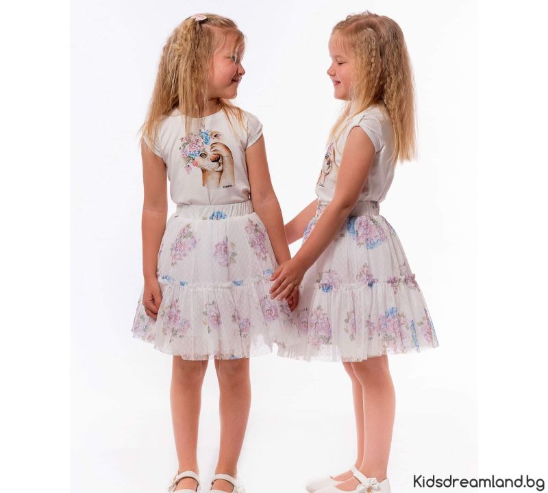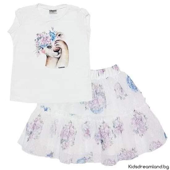 Очарователен официален комплект за момиче от две части на бранд Contrast, състоящ се от бяла тениска с къс ръкав и апликация, съчетана с ефирна пола от тюл на цветя. Коланът на полата е ластичен.