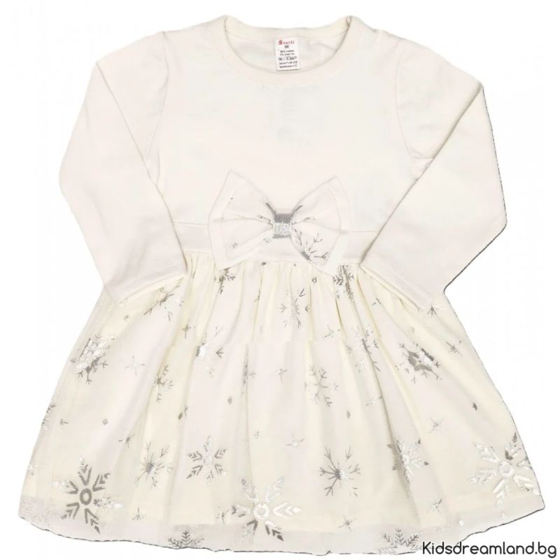Детска коледна рокля в нежен бял цвят с тюл на сребристи снежинки от Светли .