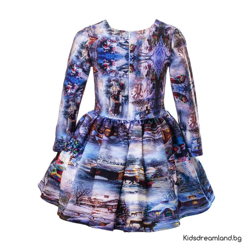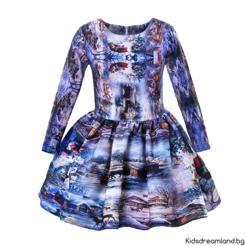 Много красива детска рокля с дълъг ръкав в синьо със зимен пейзаж.