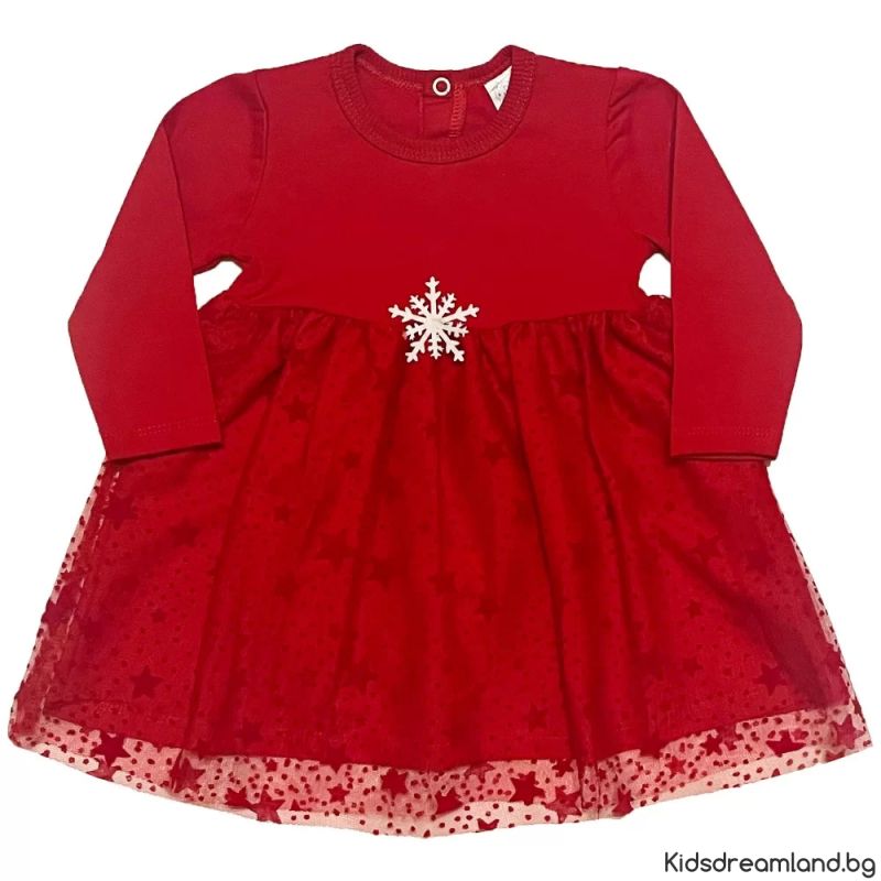 Детска коледна рокля на Светли в красив червен цвят с бяла снежинка в средата и малки звездички върху елегантен тюл пришит на частта под талията на роклята