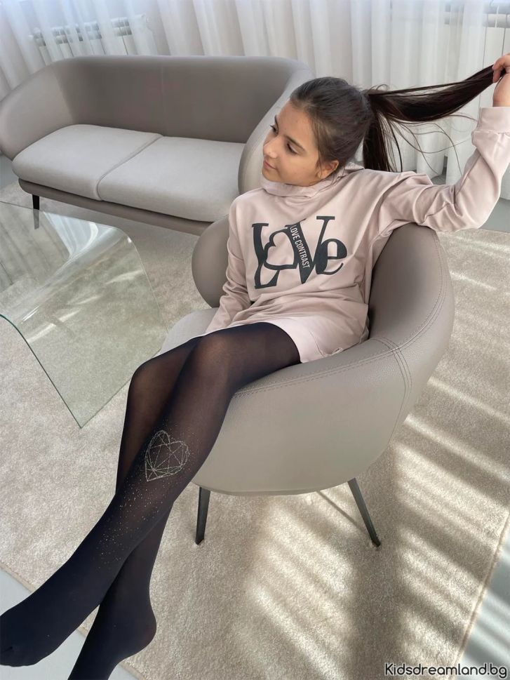 Спортна модерна рокличка Contrast от висококачествено трико с качулка има брокатена щампа отпред, идеално се съчетава с клин или чорапогащник, кецове, маратонки, боти, кецове тип чорап