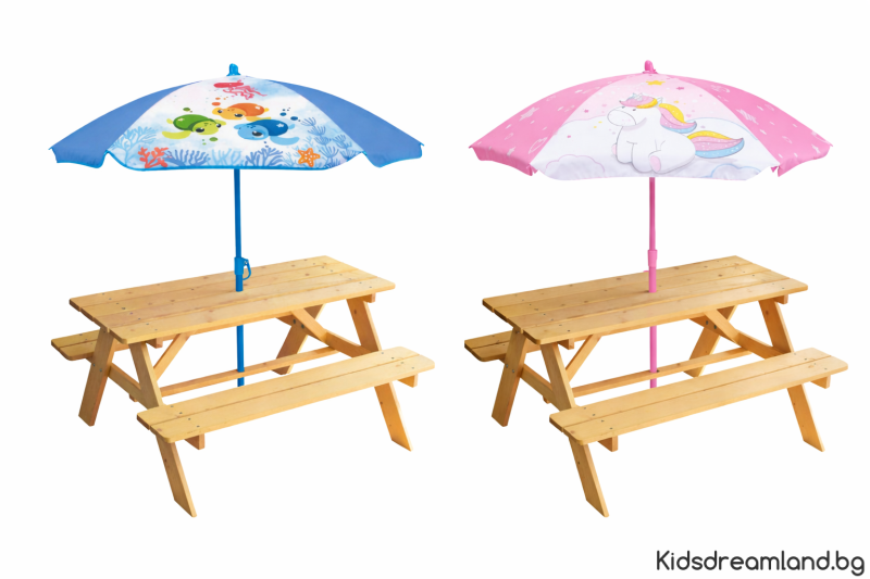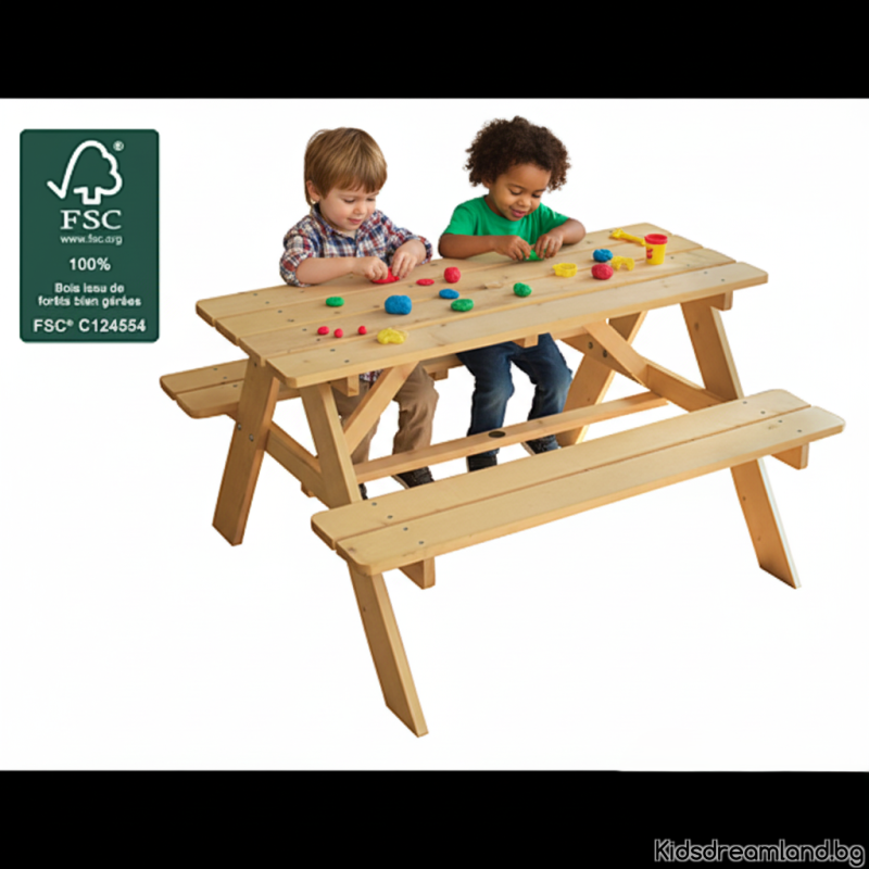 Тази дървена маса за пикник, сертифицирана от FSC, ще зарадва вашето дете. То ще се радва да седи в градината като възрастен на тази прекрасна маса от борово дърво с пейки. Размери на масата: В.53 x Ш.95 x Д.75 см. Оригинален и практичен подарък, който със сигурност ще се хареса! Лесен монтаж (включени са инструкции).