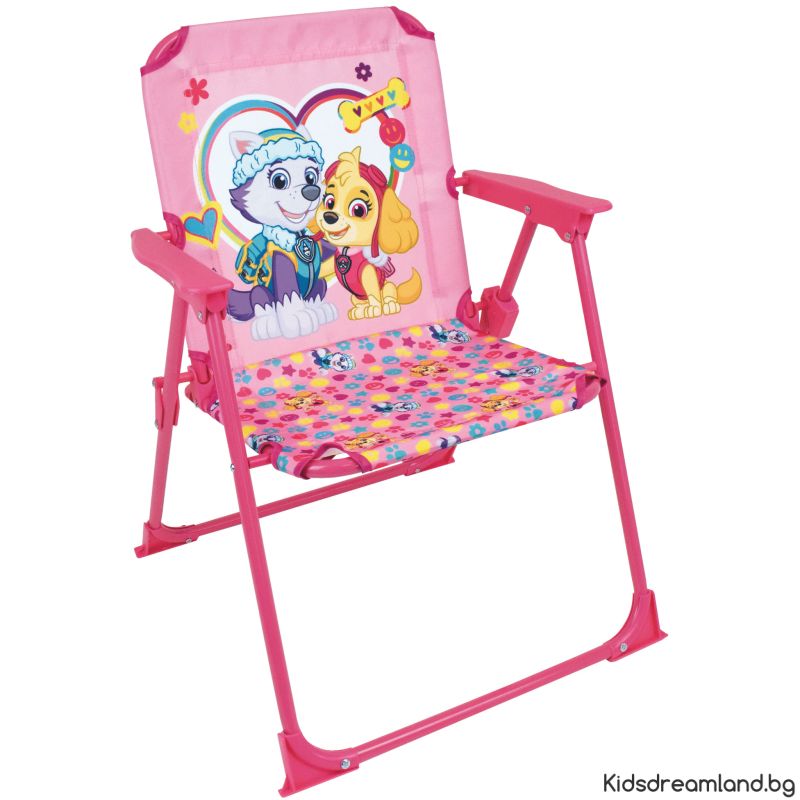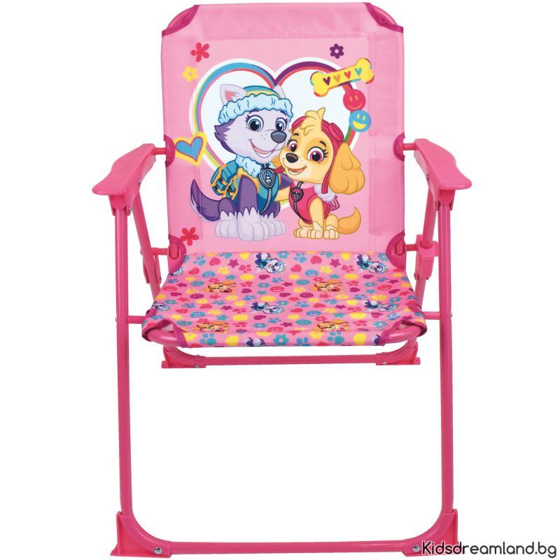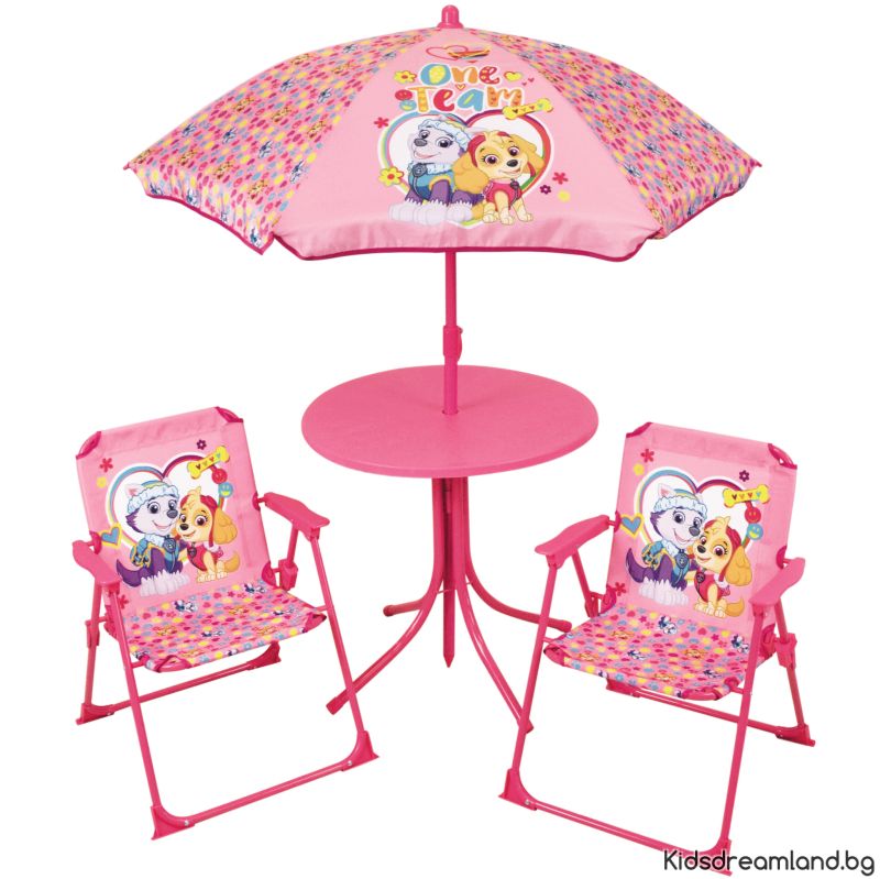Градински комплект PAW Patrol, Skye. Този хубав градински комплект се състои от два стола, маса с място за приложения чадър. Рамките са изработени от стомана, пластмасовите части са от полиетилен. И вие ли сте фен на тези две кучета и розовото ли е любимият ви цвят? Тогава този комплект е истинска задължителна покупка!
