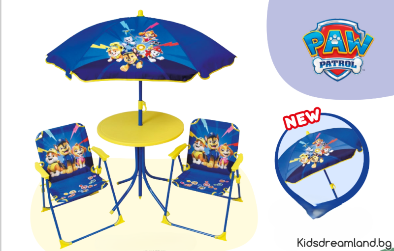 Градински комплект PAW Patrol. Този хубав градински комплект се състои от два стола, маса с място за приложения чадър. Рамките са изработени от стомана, пластмасовите части са от полиетилен. И вие ли сте фен на кучета от Пес Патрул и син ли е любимият ви цвят? Тогава този комплект е истинска задължителна покупка!