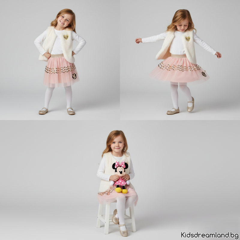 Пола с тюл и златен принт в сив нюанс с Мини Маус, за момичета в размери 3-8 години. Състав 100% пол. ОФИЦИАЛЕН ЛИЦЕНЗИРАН ПРОДУКТ