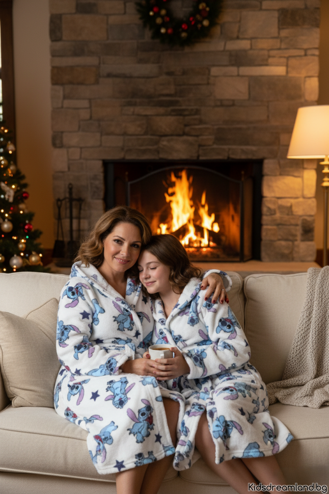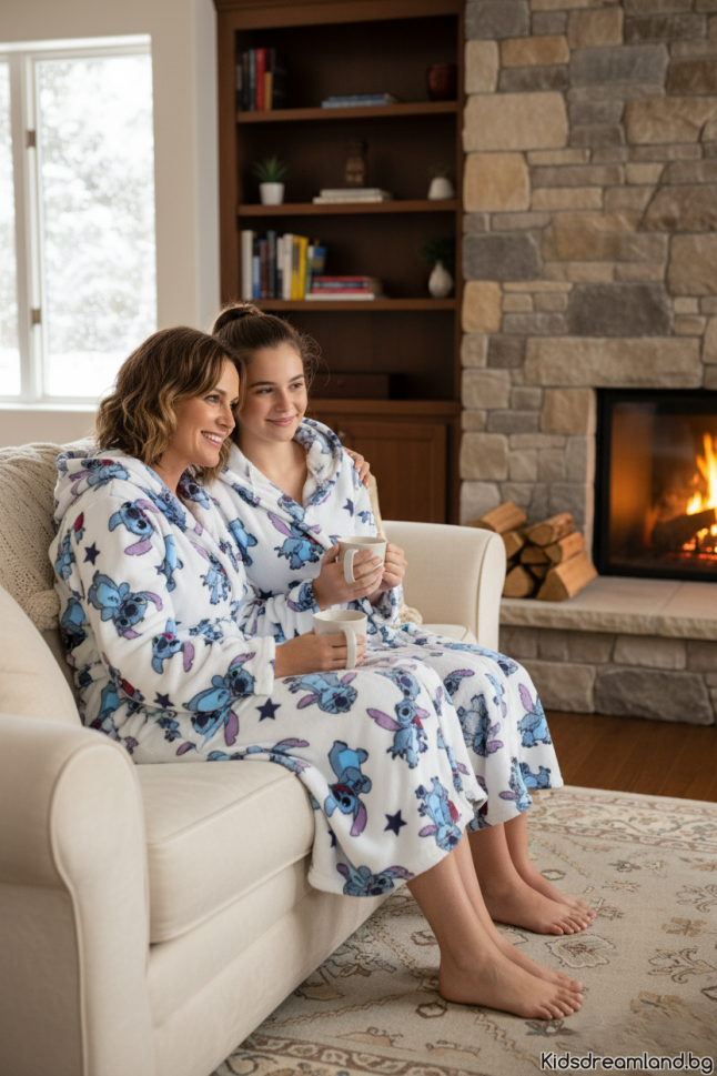 Потопете се в уюта и хавайското настроение с този мек и цветен дамски халат Lilo & Stitch.