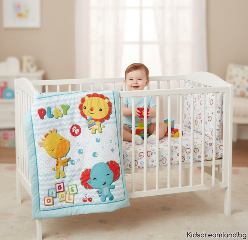 Размер: плик за завивка 110 х 130 см, втален чаршаф 100 х 140 см; калъфка за възглавница 25 х 45 см Описание За нула време ще попаднете в страната на сънищата под това памучно спално бельо със сладка животинска щампа от Fisher Price. Комплектът от 3 части се състои от чаршаф с размери 100 х 140 см, плик за завивка 110 х 130 см и калъфка за възглавница 25 х 40 см.