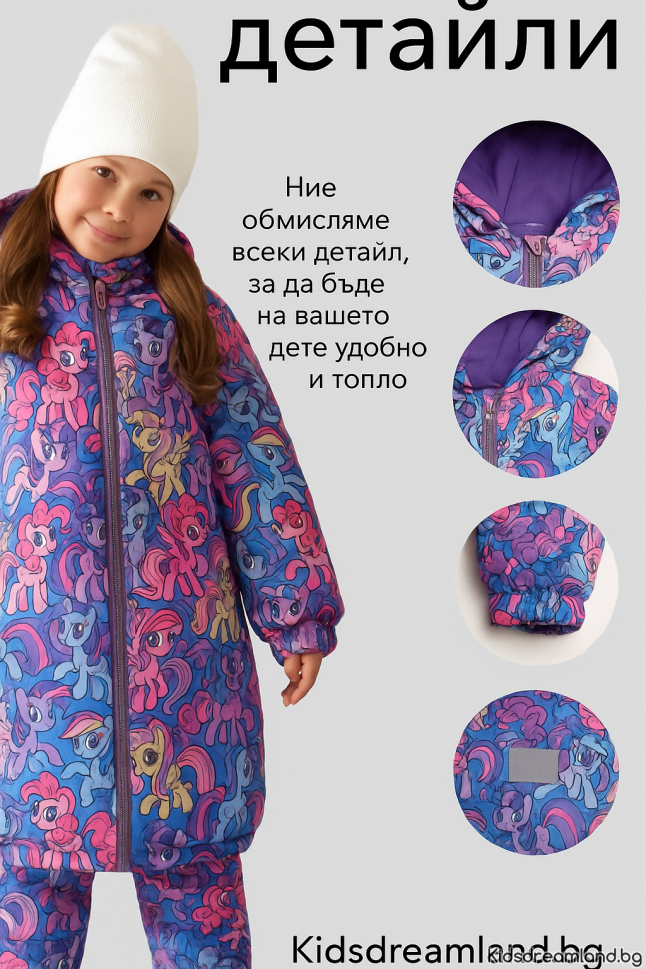 Подгответе се за зимата с любимия герой от „Моето малко пони“! Това зимно яке съчетава стил, комфорт и защита от студа – идеално за малките почитатели на веселия свят на понитата.